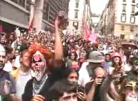 Vor knapp einem Jahr versammelten sich die Regierungschefs der größten Industrienation in Genua zum jährlich stattfindenden Wirtschaftsgipfel G-8. Während die Staatschefs und ihre Berater im frisch herausgeputzten Palazzo Ducale über den freien Warenverkehr in der Welt berieten, forderten 300.000 Globalisierungsgegner auf den Straßen des Konferenzorts eine gerechtere Welt. Noch nie hatten sich so viele Menschen zu einem Protest gegen die herrschende Weltordnung versammelt, und noch nie war die Reaktion der Polizei so scharf wie in Genua. Die Regierung Berlusconi, seit wenigen Wochen im Amt, hatte 20.000 Polizisten zusammengezogen. | |