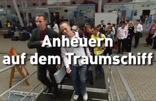 Mit bangen Gesichtern stehen die Bewerber am Kai: Was jetzt auf sie zukommt? Heute werden sie geprüft, ob sie als Kellner, Barkeeper oder Steward in Frage kommen. Es hat sich herum gesprochen. Auf der AIDA nehmen sie längst nicht jeden, die Latte hängt hoch! An Bord lernen die Bewerber ihren möglichen Arbeitsplatz “live” kennen. Das ist wichtig, sagt die Reederei, denn der Job ist hart: jeden Tag zwölf Stunden arbeiten, sieben Tage die Woche, sechs Monate lang | |