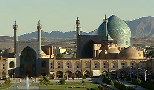Schah Abbas I. wählte Isfahan 1598 zur Hauptstadt und ließ im Rahmen umfangreicher Umbauten den Naghsch-e Dschahan ("Entwurf der Welt") anlegen, später Meidan-e Schah ("Königsplatz") genannt. Das von doppelten Arkaden gesäumte Rechteck, bis heute einer der größten öffentlichen Plätze der Welt, wurde gleichermaßen als Marktplatz, Gerichtsort, Spielfeld und Festplatz geplant und ist von bedeutenden monumentalen Bauwerken umgeben. Gegenüber des Basars zieht im Süden die gewaltige Königsmoschee die Blicke auf sich, die Abbas zu Ehren Gottes errichten ließ. Ihre ausgefeilte Architektur und die enge Verbindung von Gebäude und Dekor lassen ihre Bedeutung erahnen. | |