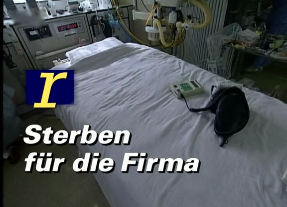 Leben und Sterben für die Firma, schuften, bis der Schlag sie trifft – die totale Hingabe gehört zum Selbstverständnis der Japaner. 10000 Menschen sterben pro Jahr an Überarbeitung – so der Rechtsanwalt Kawahito, der eine Hilfsorganisation für gestresste Angestellte gegründet hat. Dass nur wenige Fälle an die Öffentlichkeit dringen, liegt an der schwierigen Beweislage. Denn bis der Tod durch Überarbeitung vor Gericht als Arbeitsunfall anerkannt wird, vergehen Jahre. | |